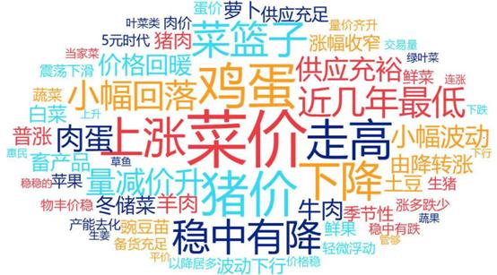 2. 蔬菜均价略有下跌。重点监测的28种蔬菜周均价每公斤5.73元,环比跌0.2%,价格在连续4周上涨后有所回落,同比高13.2%。分品种看,10种蔬菜价格下跌,18种上涨。其中,油菜、平菇、黄瓜和菜花价格环比分别跌7.9%、7.3%、6.0%和5.7%,其余品种价格跌幅在5%以内;洋白菜、韭菜、西红柿和冬瓜价格环比分别涨8.8%、7.2%、5.7%和5.6%,其余品种价格涨幅在4%以内。