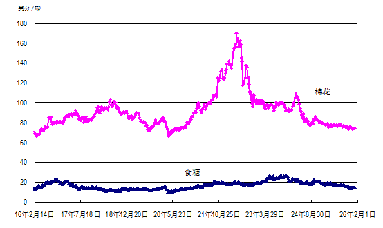 2.原糖和棉花价格环比小幅下跌。国际糖料理事会原糖周均价每磅14.46美分(每吨319美元),环比跌0.7%,同比低20.5%;国际棉花价格指数(SM级)每磅74.18美分(每吨1635美元),环比跌0.3%,同比低6.0%。