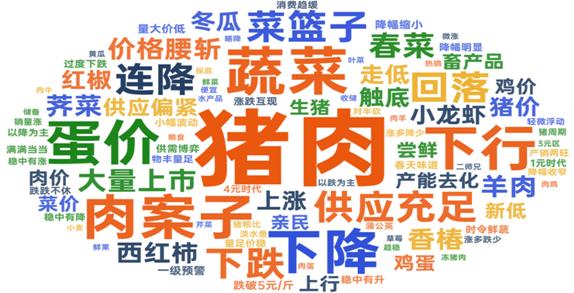 2. 蔬菜均价继续下跌。重点监测的28种蔬菜周均价每公斤4.96元,环比跌3.1%,同比高2.9%。分品种看,25种蔬菜价格环比下跌,3种上涨。其中,大葱、冬瓜、芹菜、菠菜和洋白菜价格环比跌幅较大,西葫芦、南瓜和茄子价格环比有所上涨。