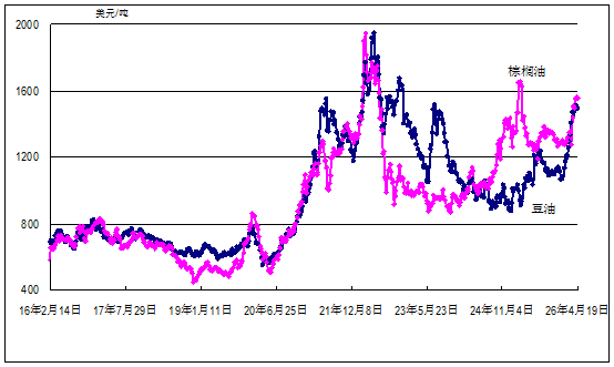 2. 大豆、豆油、食糖和棕榈油价格下跌。美国芝加哥商品交易所大豆和豆油最近期货合约收盘周均价分别为每吨427美元和1490美元,环比分别跌0.2%和跌1.1%,同比分别高12.1%和高43.1%。国际糖料理事会原糖周均价每磅13.93美分(每吨307美元),环比跌5.2%,同比低21.6%。马来西亚棕榈油荷兰鹿特丹港到岸周均价每吨1555美元,环比跌0.9%,同比高17.1%。