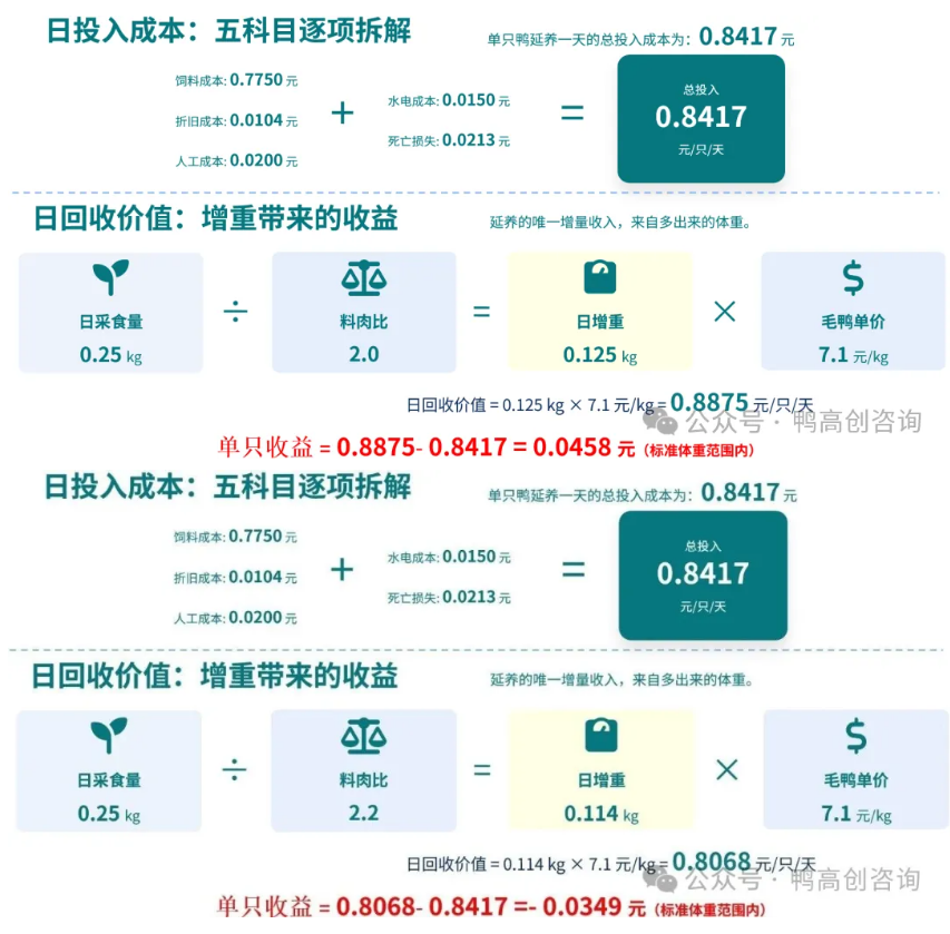 以数据指导出栏举例:鸭子到底是多养1天合适还是少养1天合适?就需要准确知道每天的费用与产生的价值,费用包含:饲料、水电、人工、租赁、死淘;价值包含:增重所带来的收益。另外还需考虑,如果不再标准体重范围内折率、扣罚的影响。在这些数据中最关键的是出栏前一天准确的吃料量与增重,这两个数据变异性最大也是影响盈亏的关键。计算如下图: