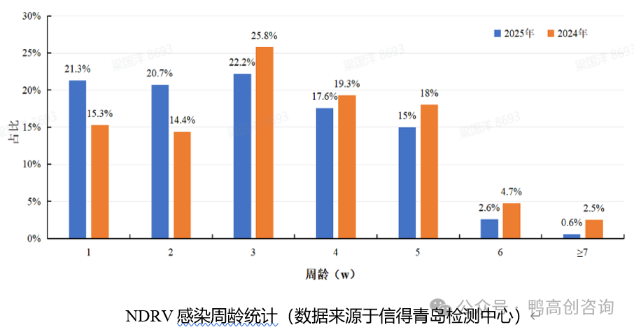 2025年的监测发现,NDRV越来越容易感染小雏鸭——1~2周龄雏鸭的检出占比,比2024年明显提高,直接导致脾坏死病的发病日龄提前。这种情况不仅会造成雏鸭伤亡、鸭群生长不均匀,还会抑制鸭群的免疫力,影响疫苗的效果,让鸭群更容易感染其他疫病。