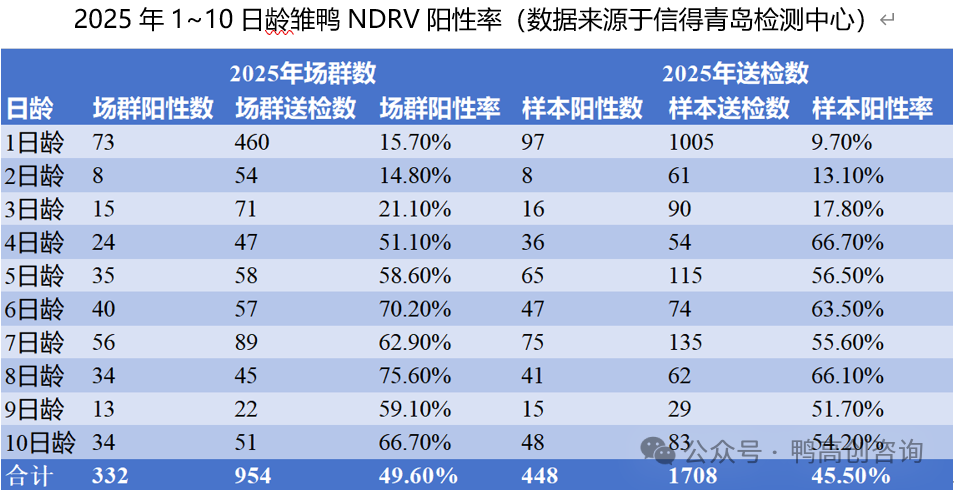 从2025年1~10日龄雏鸭的检测数据来看,病毒感染的情况不算乐观,核心规律如下: