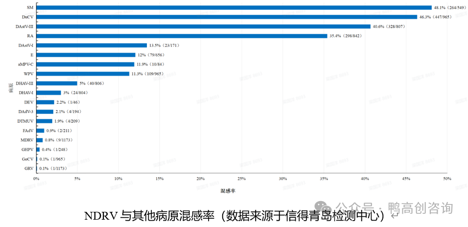 1. 常见混感病原:和沙门氏菌的混感率48.1%、和鸭圆环病毒的混感率46.3%、和鸭星状病毒的混感率40.2%,这三种是最常见的混感组合。