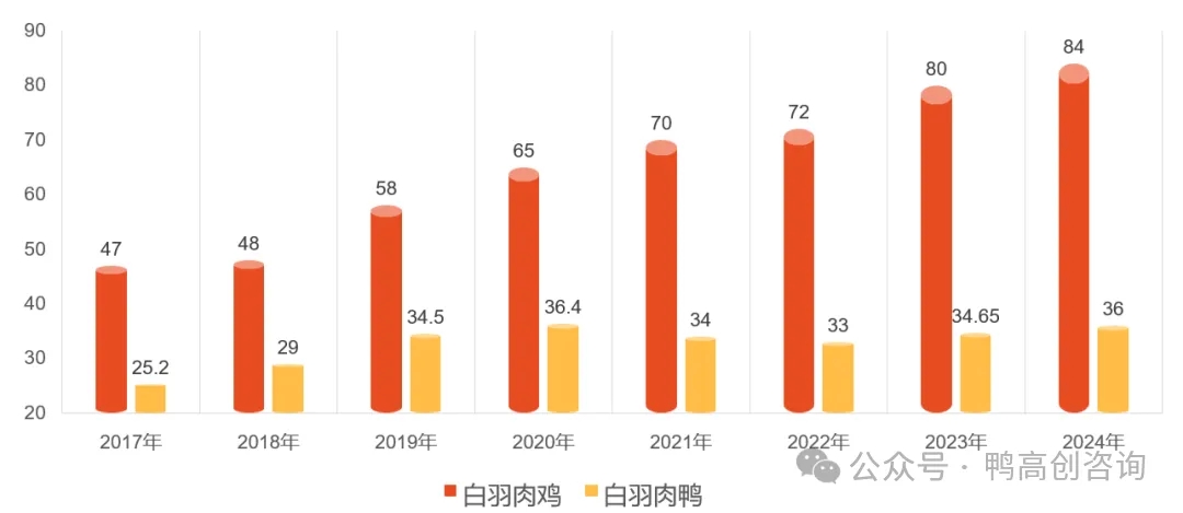 在禽肉市场上,一个有趣的现象引人深思:过去十年,肉鸡产业规模几乎翻倍,从40亿只增长至90亿只;而肉鸭产业却始终在35亿只左右徘徊,陷入“一增产就亏损”的怪圈。