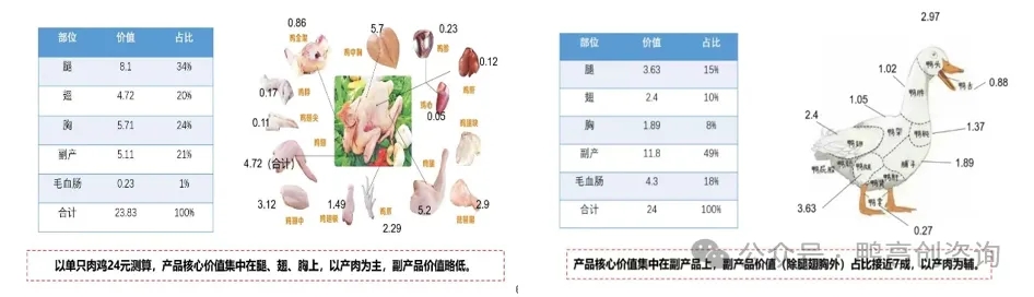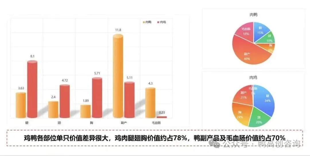 肉鸭与肉鸡在消费结构上存在根本区别。肉鸡的主要产品集中于鸡胸、鸡腿和鸡翅,而肉鸭的主产品则集中在鸭副产物上。这一差异决定了两大产业不同的发展路径。