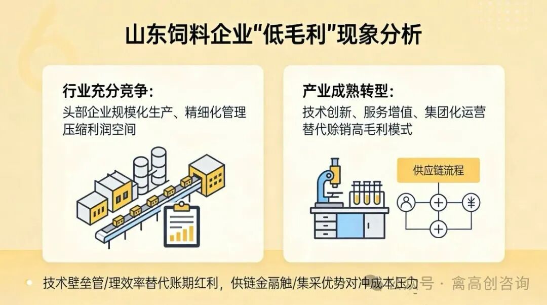 总而言之,任何一个产业的充分竞争都会使行业平均利润下降。 山东饲料企业的“低毛利”,实则是产业发展成熟的体现。一方面,山东饲料行业竞争激烈,头部企业通过规模化生产、精细化管理不断压缩利润空间,这是行业进入成熟期的典型特征;另一方面,山东饲料企业早已摆脱了依赖赊销、高毛利的生存模式,转向了技术创新、服务增值与集团化运营的发展路径,用技术壁垒、管理效率替代了账期红利,用供应链金融、集采优势对冲了成本压力。