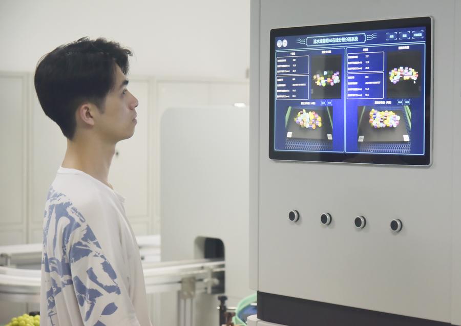 一串串翠绿的阳光玫瑰葡萄在传输带上排队行进,只需几秒它们就可无损通过“体检”,尺寸和糖度显示在屏幕上。