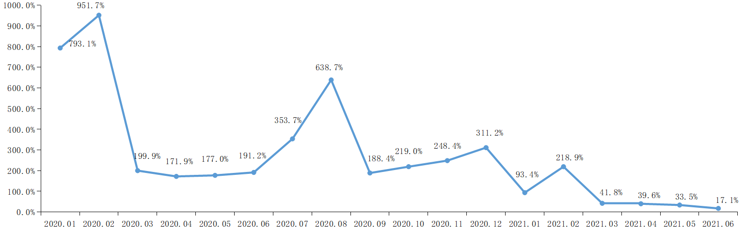 南美白对虾出塘量同比减少。受2020年第四季度南美白对虾投苗量减少及养殖成功率下降影响,今年第一季度南美白对虾供应同比减少。随后因省内多地区禁止餐饮食肆堂食,对虾消费需求减弱,南美白对虾出塘量进一步减少。据省农业信息监测体系数据,2021上半年我省南美白对虾出塘量同比减少82.1%,海水养殖对虾平均出塘量为1116.9公斤/亩,同比减少6.1%。
