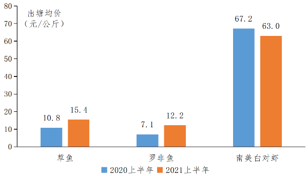投苗量同比增加。因今年初期鱼虾行情上行,养殖基地看好后市,积极增加投苗。据省农业信息监测体系数据,2021上半年我省草鱼投苗量同比增加315.4%,但因存塘规格较小,存塘量同比减少16.0%;罗非鱼投苗量同比增加45.8%,存塘量同比增加343.3%;南美白对虾投苗量同比增加66.7%,存塘量同比增加53.4%。总的来看,2021年上半年我省基地生产平稳,水产品产量同比增加5.4%,供应有保障。