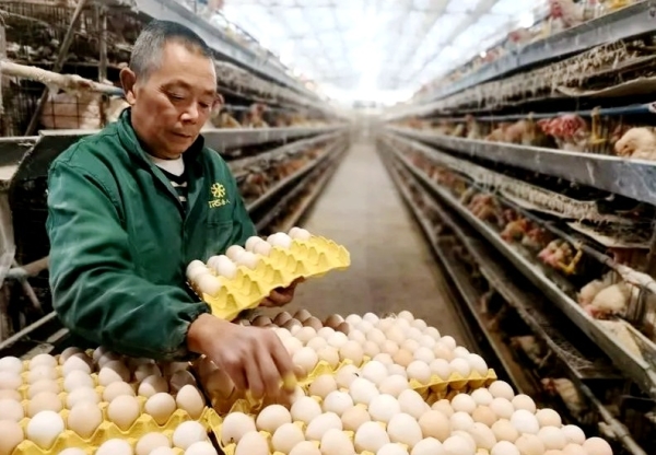 “咯咯哒……”12月5日,走进铜仁市松桃自治县迓驾镇青山村富民蛋鸡养殖专业合作社,只见一排排、一层层鸡笼整齐有序,一只只蛋鸡争相吃食,工人正忙着捡蛋、装箱、搬运。看着一箱箱鸡蛋装上集装车往外运,村党支部书记莫长江笑得合不拢嘴。