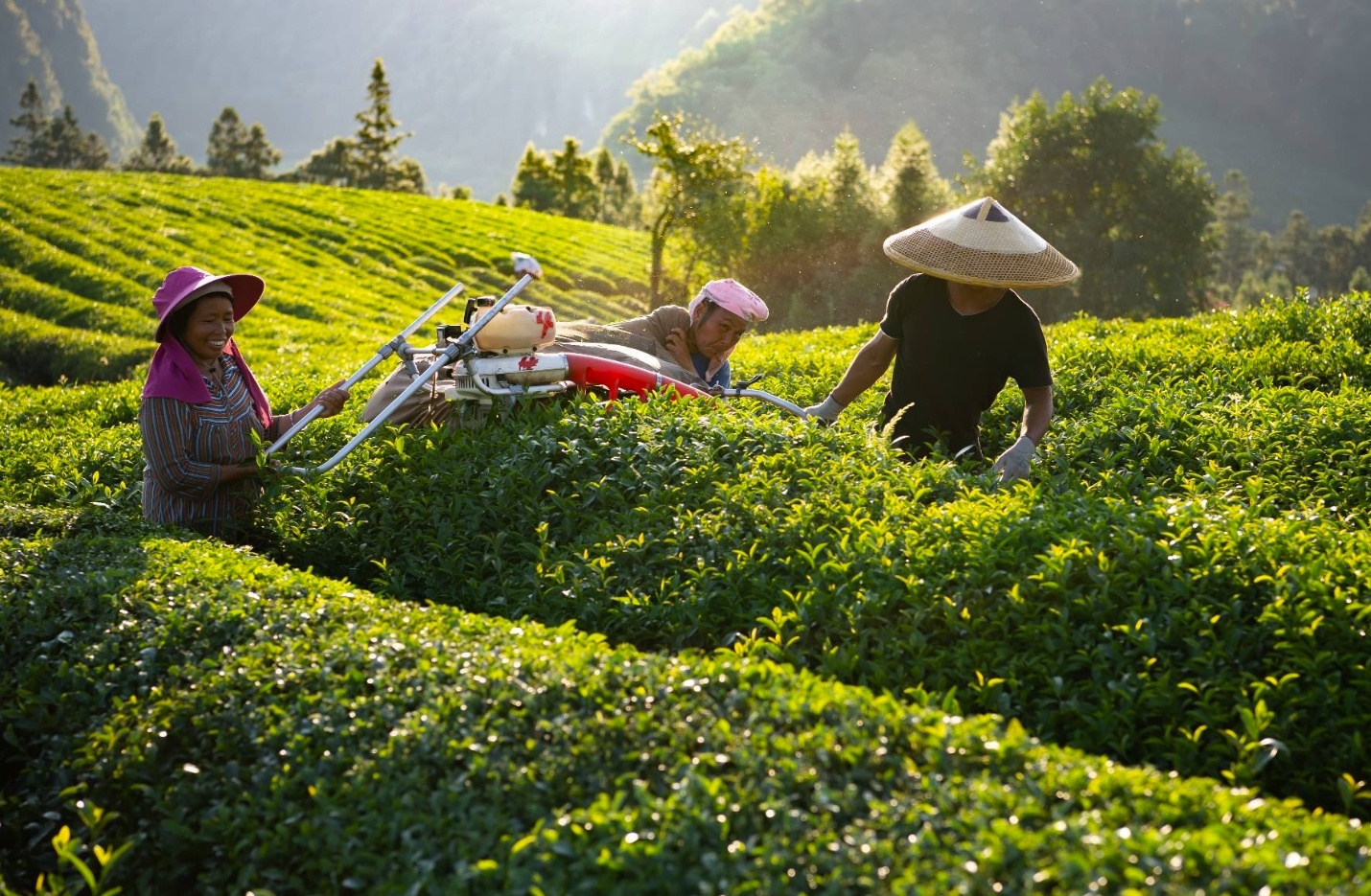 近日,走进黔东南州黎平县高屯街道桂花台茶场,放眼望去,连绵不绝的茶山郁郁葱葱,茶香茶韵扑面而来,宛若世外桃源。茶山上,有的工人架着采茶机器采摘茶叶,有的在做茶园管护。