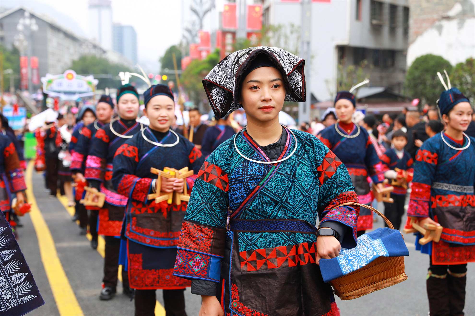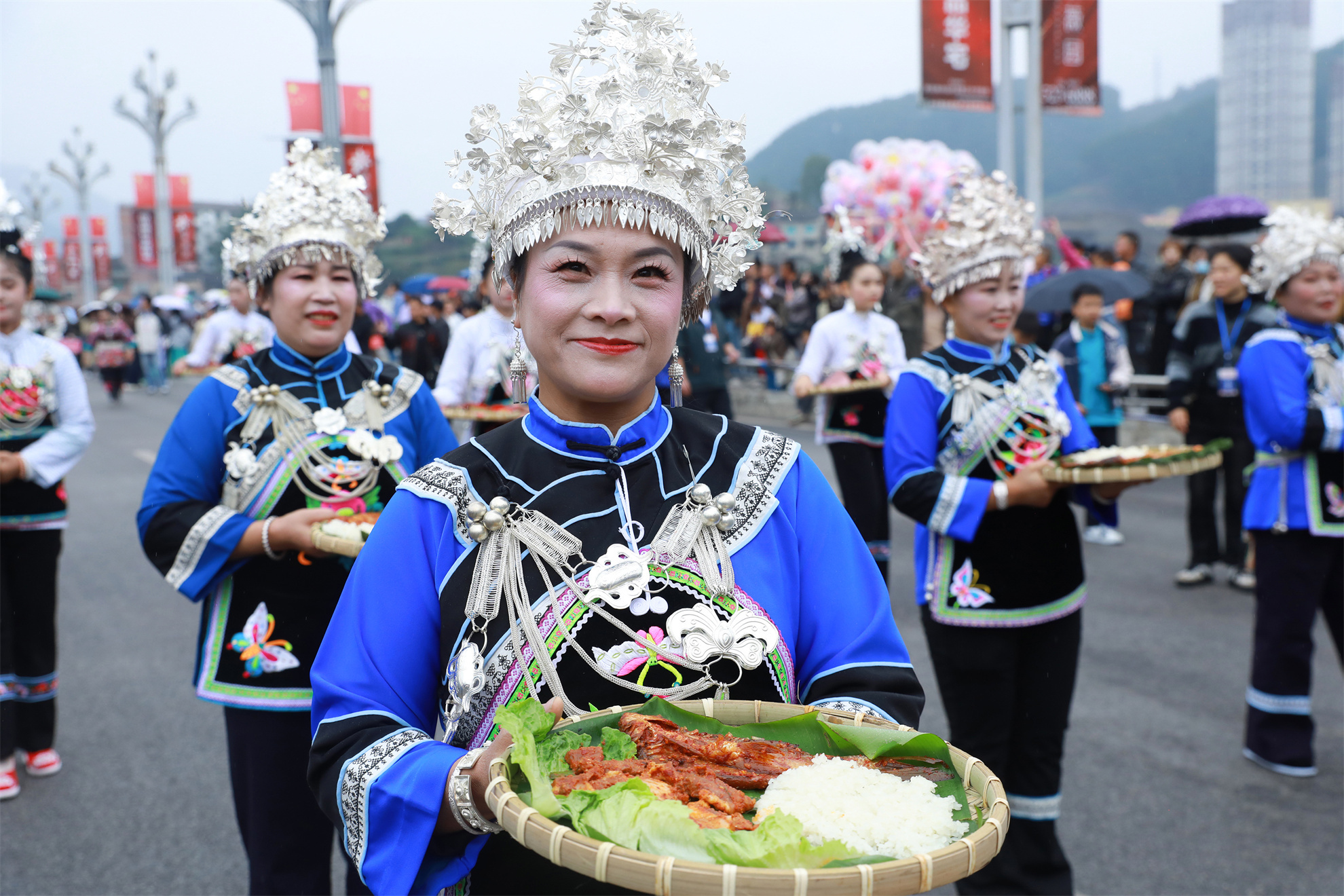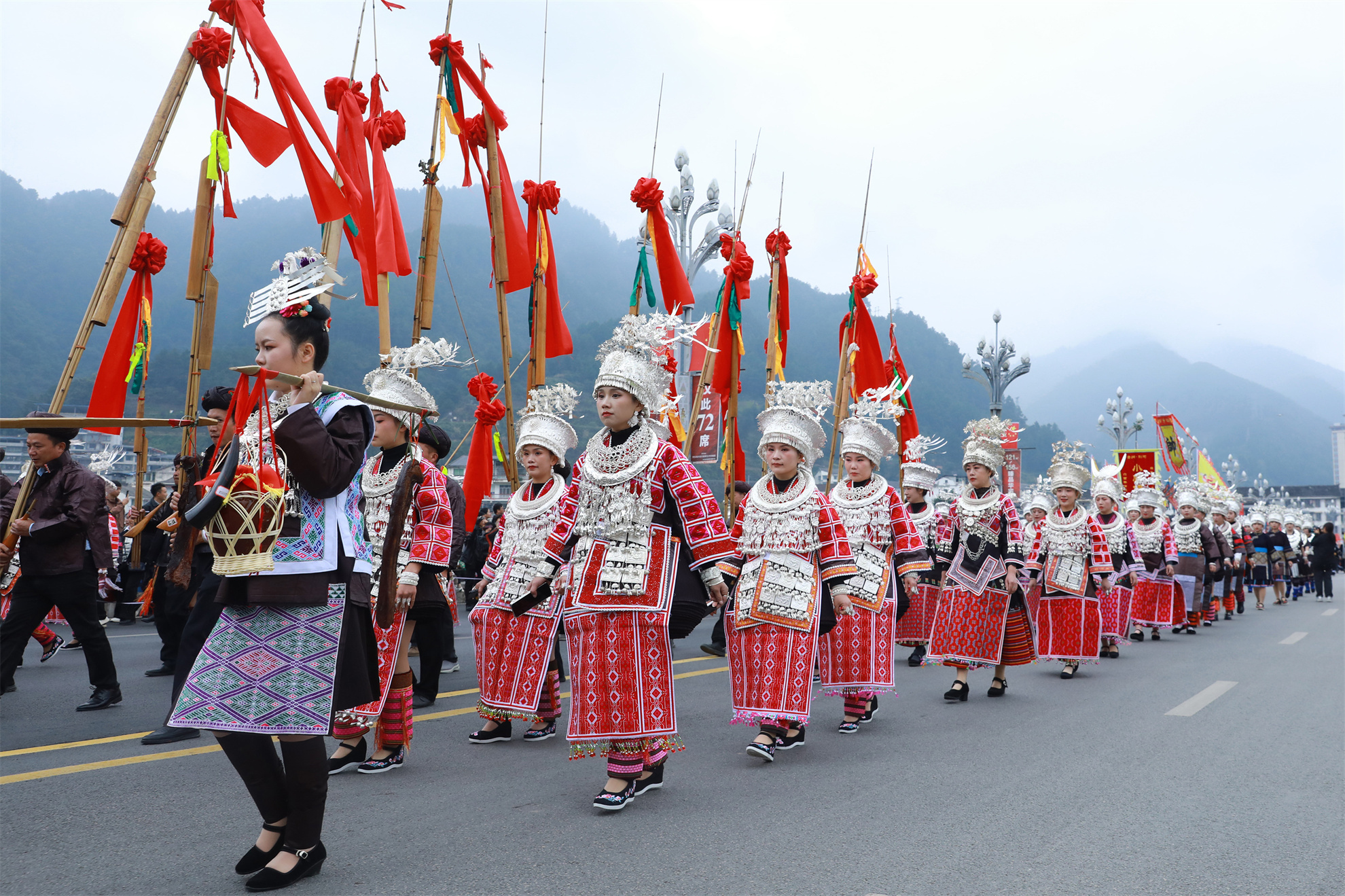 活动期间举行的“2025中国农民丰收节村歌大赛总决赛民族团结大巡游”,以“多彩”和“惊艳”两词拉开序幕。来自黔东南州16个县(市)的1000余名群众,身着民族盛装,组成16支巡游方阵,依次展示剑河县农耕特产、水鼓舞、飞歌等非遗项目及另外15个县(市)的民族特色风采。巡游过程中,苗族刺绣、银饰锻制等非遗手工艺定点展示与巡游展示交相辉映,全力呈现丰收喜悦与民族团结盛况。