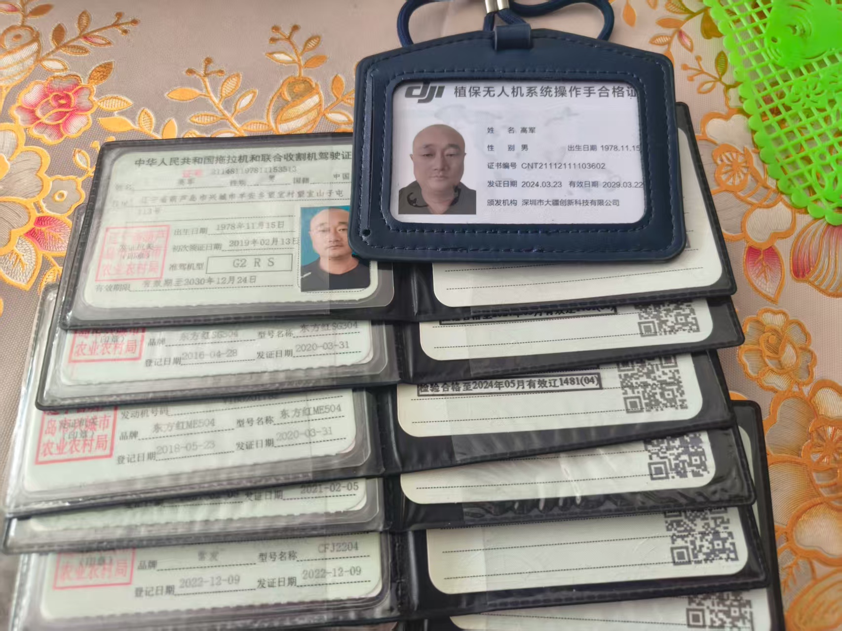 鼓鼓囊囊的小包里面除了手机还有一堆车钥匙和一摞蓝本本。“这三个是农机的农用拖拉机,轮式收割机,履带式收割机,这个农用无人机是去年考下来的,这些吃饭的家伙,自然要随身带着。”自从买了农机考了驾照,高军成为远近闻名的新型职业化农民,除了耕种自己的500亩土地外,还给周边的村民提供托管服务。“隔壁的曹庄镇有300多亩玉米等着打药,这都催一早上了,有了农机,干活轻松多了,愁的是活儿太多接不过来。”高军笑着说。