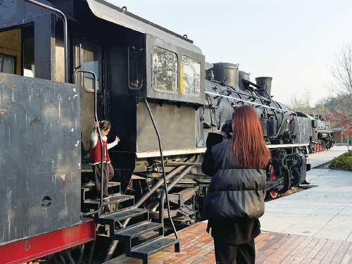 山东省日照市五莲县白鹭湾小镇内,游客正在拍照留念。
