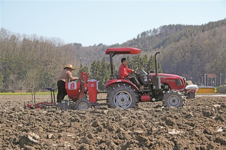 3月10日,在安康市汉滨区晏坝镇田坝社区中公新型农业产业三产融合示范产业园,安康中公农业发展有限公司总经理陈元寿驾驶播种机在地里忙活。